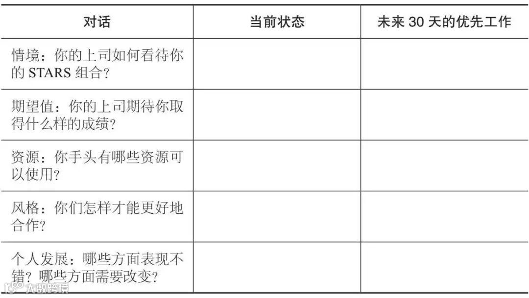 · 关于情境诊断的对话。在这轮对话中,你力图理解你的新上司如何看待你所继承的STARS组合。是否存在初创启动、整顿转向、加速增长、重新组合和保持成功的要素?组织是怎样到达这一步的?哪些要素使这个情境成为一个挑战?你可以使用组织内的哪些资源?你的观点可能会与上司不同,但是掌握他是如何认识这一情境的非常重要。