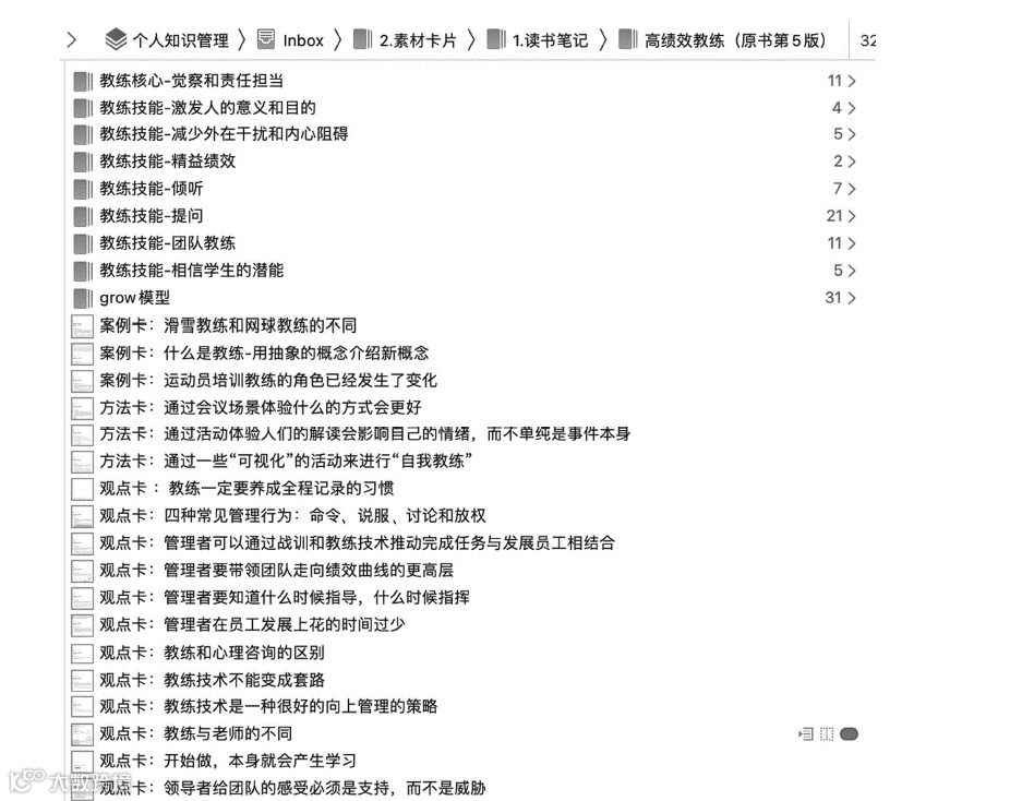 下图展示的是作者王专看完《高绩效教练》这本书后整理的卡片,一本书的学习形成了120 张卡片,而不是一篇长长的摘要笔记。