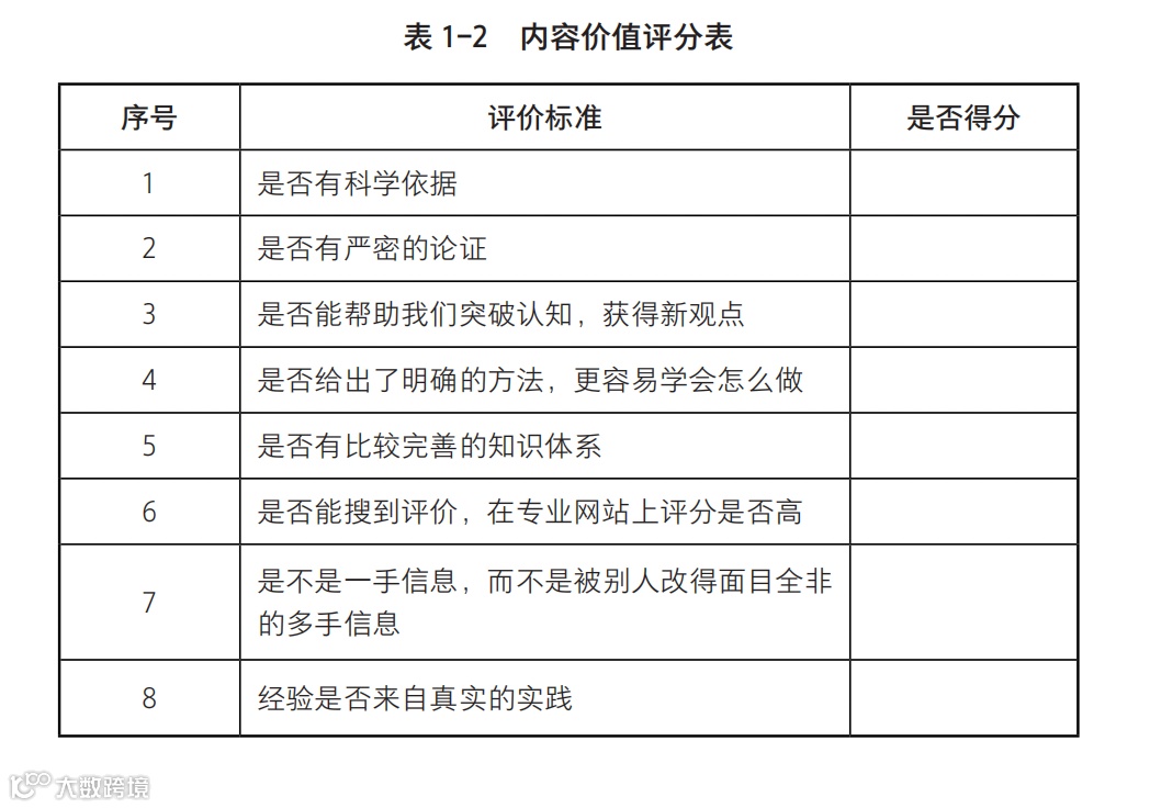 内容的“价值大小”,可以依据下文中的评分表进行打分。评分表里的每一项内容是个“是否选择题”,答案选择“是”,该项得1分,满分为8分。