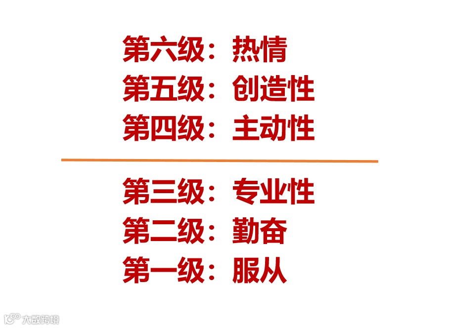 在图的最下方(第一级)是服从——员工每天都要出勤,严格遵守公司规定和工作流程。服从非常重要,没有服从,大型企业就无法运转。第二级为勤奋,员工辛勤工作,直到工作完成才离开,履行个人职责,出色地达成工作成果。这一点同样非常重要,如果员工懒懒散散,企业很难获得成功。第三级是专业性或者说个人能力。