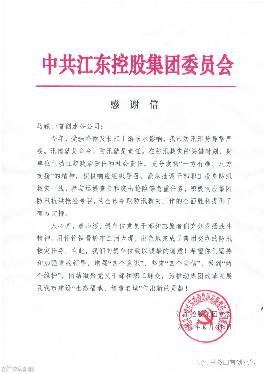 “贵单位党员干部和志愿者们充分发扬战斗精神,用铮铮铁骨铸牢江河大堤,出色地完成了集团交办的防汛救灾任务……”8月11日,江东控股集团党委给公司发来感谢信,对公司响应政府和股东号召积极支援防汛一线表示感谢,对公司党委在防汛救灾组织工作中发挥的核心作用和突出表现给予了高度肯定和赞扬。