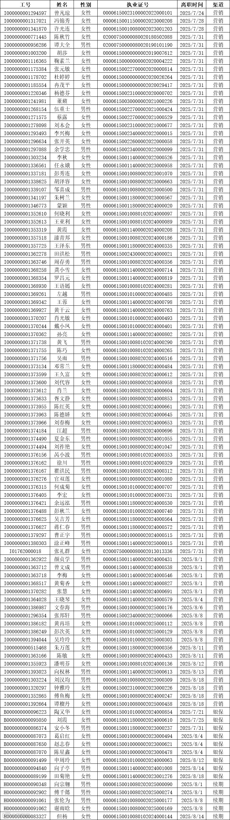 本次公示离职人员包含营销渠道87人,银保渠道9人,续期渠道5人,共计101人。公示的信息包含离职人员工号,姓名、性别、执业证号码以及离职时间。