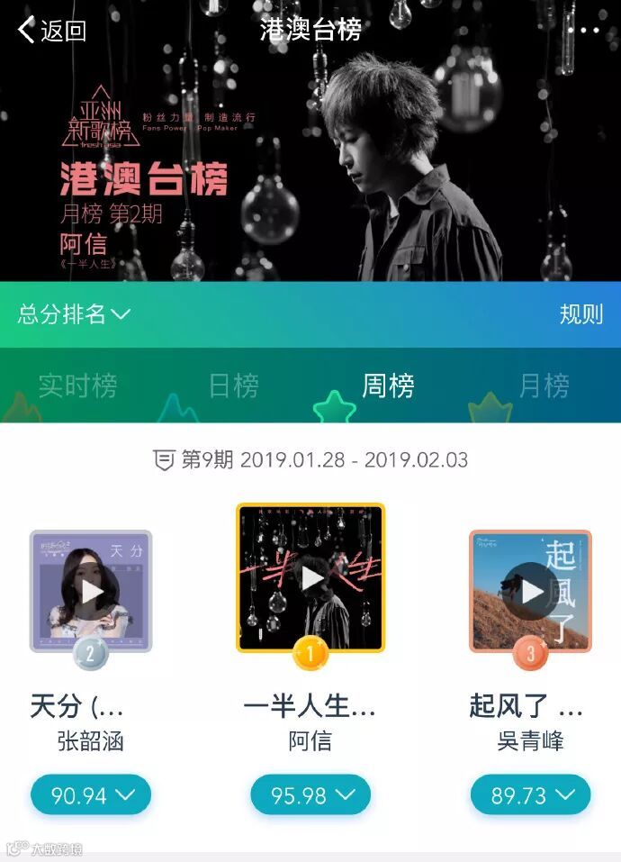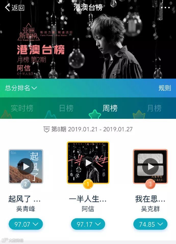 阿信《一半人生》连续四周 获得亚洲新歌榜港澳台榜周冠军