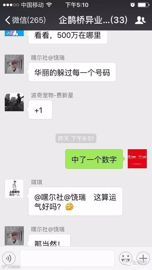 收到500万记得投资企鹊桥,我们在默默的等你们宣布中奖,握草!果然有人中了!