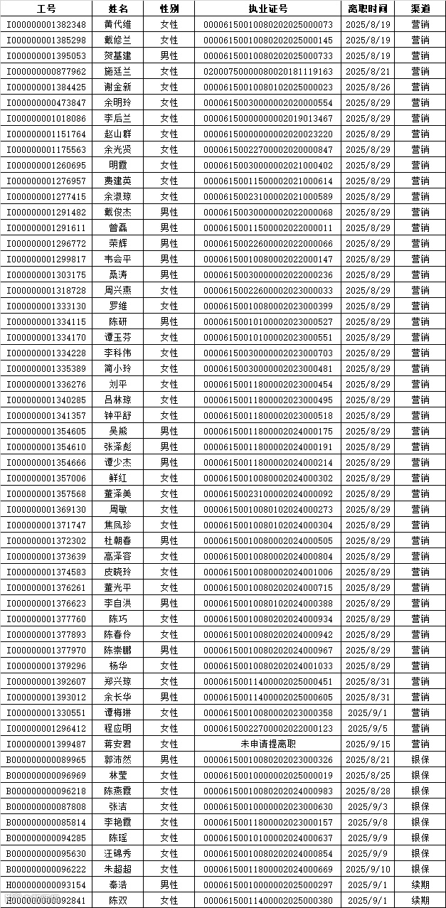 本次公示离职人员包含营销渠道47人,银保渠道8人,续期渠道2人,共计57人。公示的信息包含离职人员工号,姓名、性别、执业证号码以及离职时间。