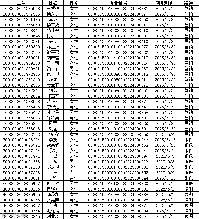 本次公示离职人员包含营销渠道24人,银保渠道9人,续期渠道6人,共计39人。公示的信息包含离职人员工号,姓名、性别、执业证号码以及离职时间。