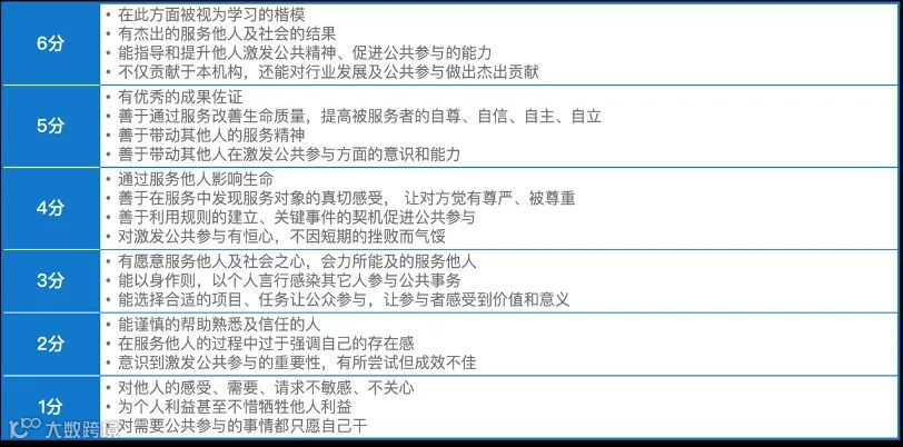 以下示例为“服务精神”能力的分级评价标准(1~6分)。当然,真正能做到层次分明,对文字能力有一定的要求。