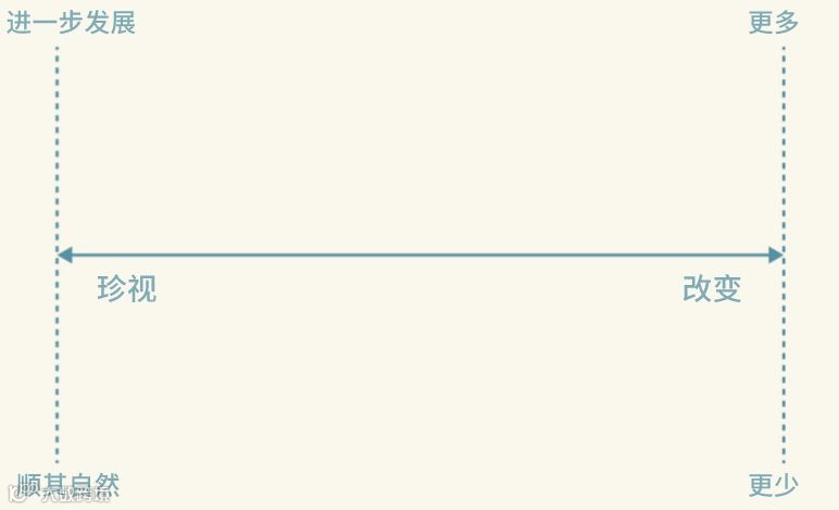 珍视/改变回顾框架:这也是我非常喜欢的一个思考框架。这个思考框架的一方是希望珍视的内容。在这个维度,我会进一步问自己,是想要或需要进一步发展(比如,集中注意力实现进一步提高和成长),还是顺其自然(比如,不做任何干预,接受任何可能出现的结果)。另一方则是我希望改变的内容。在这个维度,我会问自己,自己希望更多还是更少地看到这些内容。