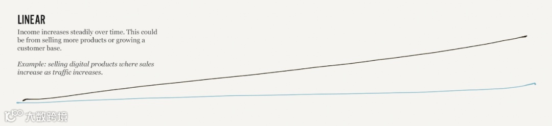 在我的工作中,最常见的线性增长是数字产品的销售:随着流量的增加,销售额也在增加。这不是指数增长,因为流量仍然是瓶颈,但每发一篇新内容或网站排名上升几位都会带来几百人的访问新增。随着时间的推移,这会带来更多的销售和收入增长。