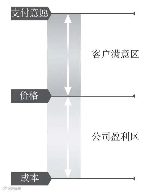 如果能了解客户对产品的最高支付意愿,那么定价会更加有效。定价应介于成本与最高支付意愿之间,以吸引客户、发展业务。若定价高于最高支付意愿,哪怕只贵了一分钱,也会导致客户流失。若定价低于成本,即使只便宜一分钱,你也会亏本,从而威胁公司的生命线。有鉴于此,我们建议你构建如图2所示的连续体,并将定价决策可视化。任何高于定价、低于最高支付意愿的产品都能使客户受益,因此该范围被称作“客户满意区”。任何低于定价、高于成本的产品都能使公司受益,因此被称为“公司盈利区”(又名“首席财务官满意区”)。