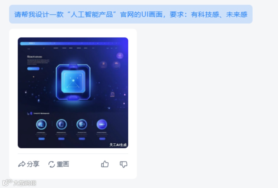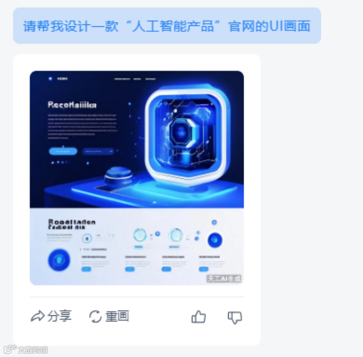 又或是,要求天工AI帮忙设计一款“人工智能产品”官网的UI画面。