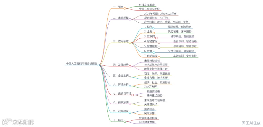 长达106页、几十万字的关于【中国人工智能行业现状分析及投资趋势预测报告2023-2030年】在一分钟内就被拆解出来,甚至还给出了清晰的脑图。