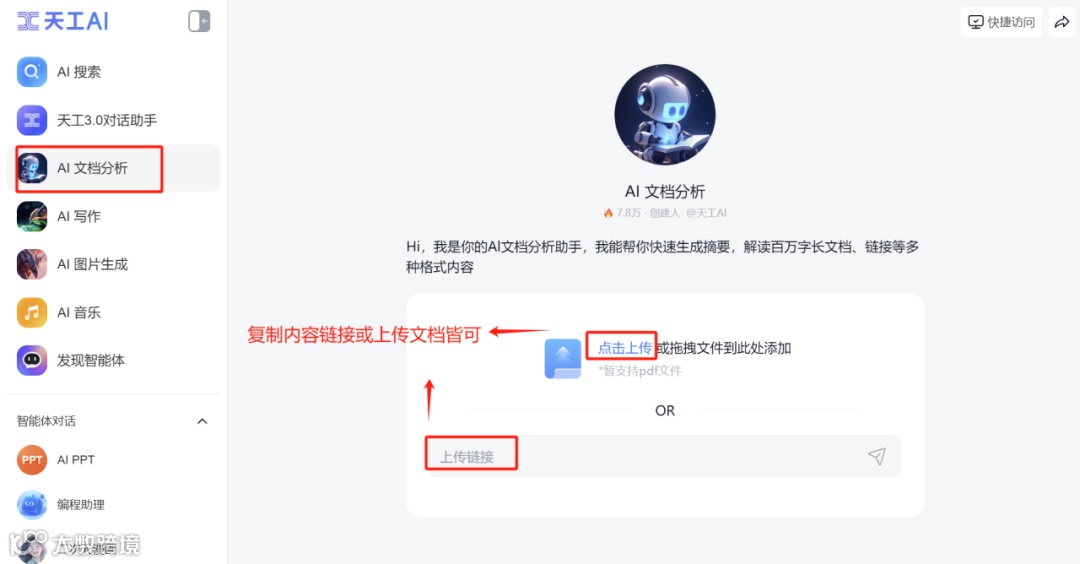 而不止是写作,天工AI还可以进行百万字的文档分析拆解,找到天工【AI文档分析】功能,上传你想要了解的文档,或者直接利用天工【搜索】找到想要了解的问题答案,复制链接都可。