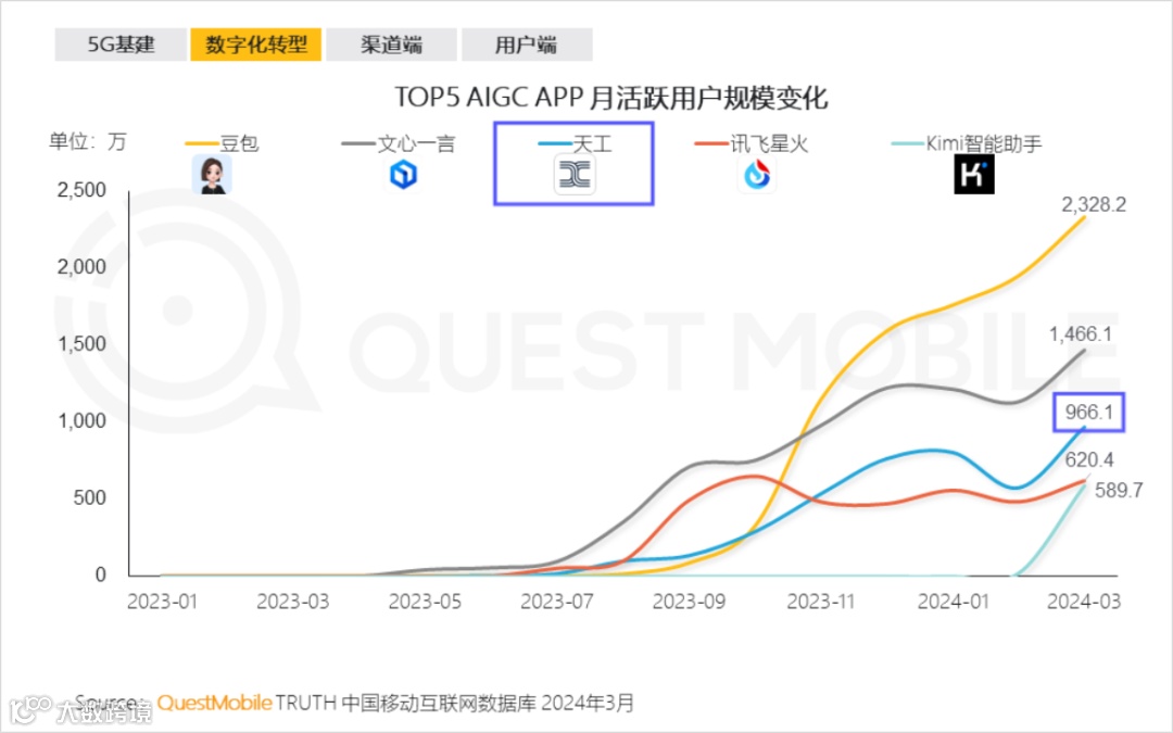 另外,据QUEST MOBILE数据显示,天工AI的MAU逼近千万,仅次于文心一言和豆包,远超Kimi,在前几日同花顺披露的公告中其日活用户(DAU)已经突破100万,可见天工AI颇受用户欢迎。