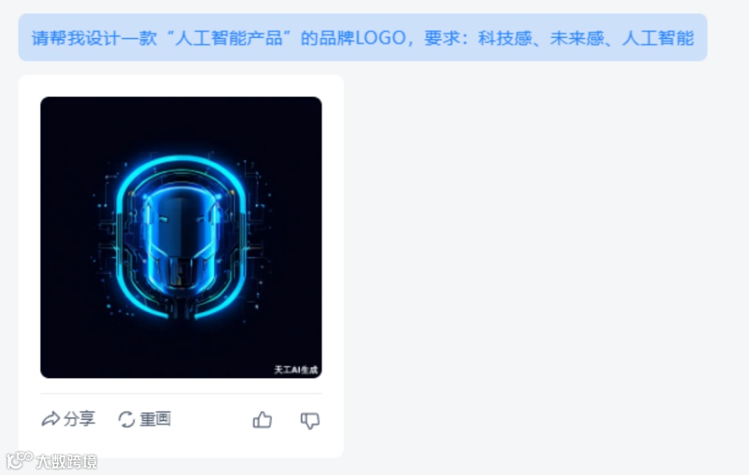 找到天工【AI图片生成】功能,输入:请帮我设计一款“人工智能产品”的品牌LOGO