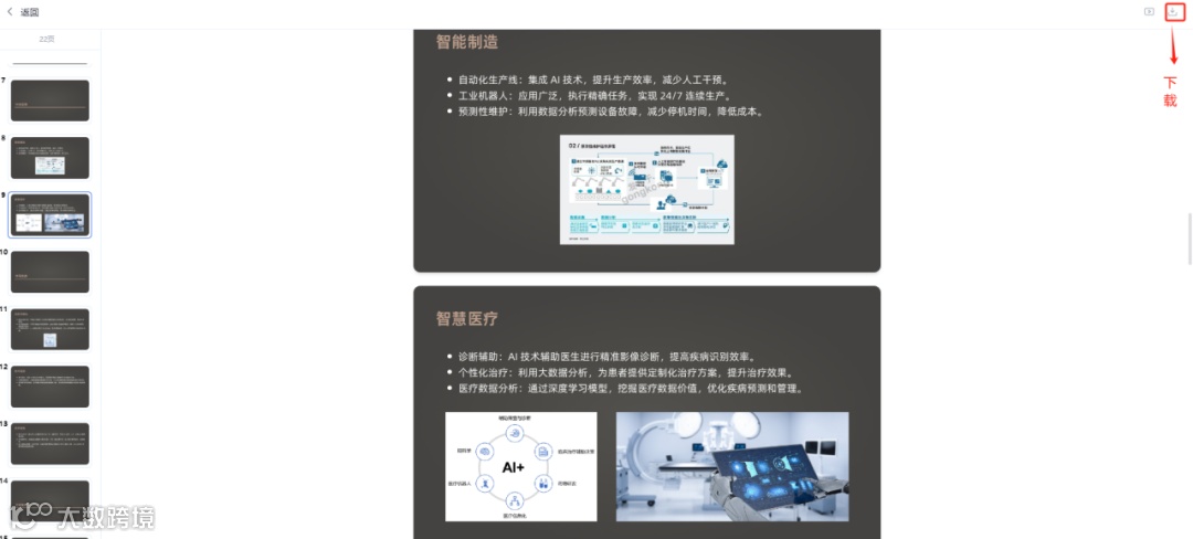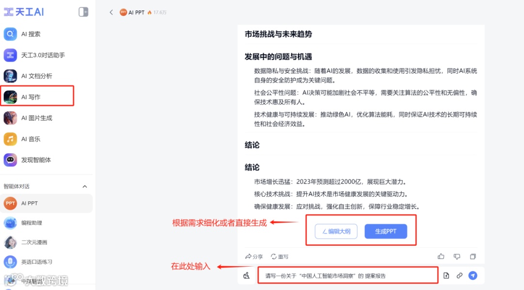 不到一分钟一份关于【中国人工智能市场洞察】的提案PPT就写好了,并且逻辑清晰、观点明确,并且给出了足够的数据支撑和案例讲解,这样的效率,没有哪个文案工作者能比得上。