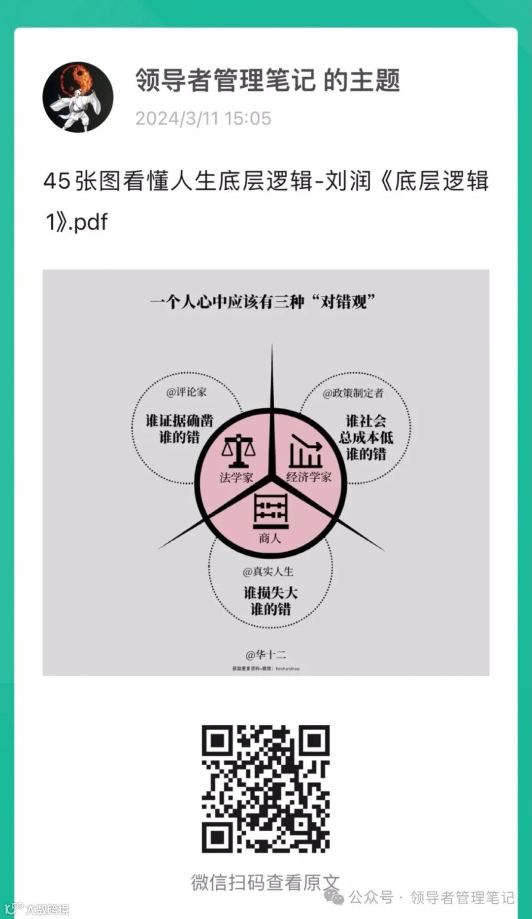 三峯经营了一个《领导者管理资料》“知识星球”,主要是面向企业管理人员、领导者,以及希望成为一流领导者的朋友提供“管理&领导力”相关的资料与咨询沟通,目前会员超过1800人,资料超过2600份,并且每天都在更新。有兴趣的读者可以扫描下方二维码了解,目前加入《领导者管理资料》“知识星球”可以获得“职场破局、时间管理、阿里管理三板斧、易经智慧、思维工具、沟通能力等在内的10份付费视频课程”。