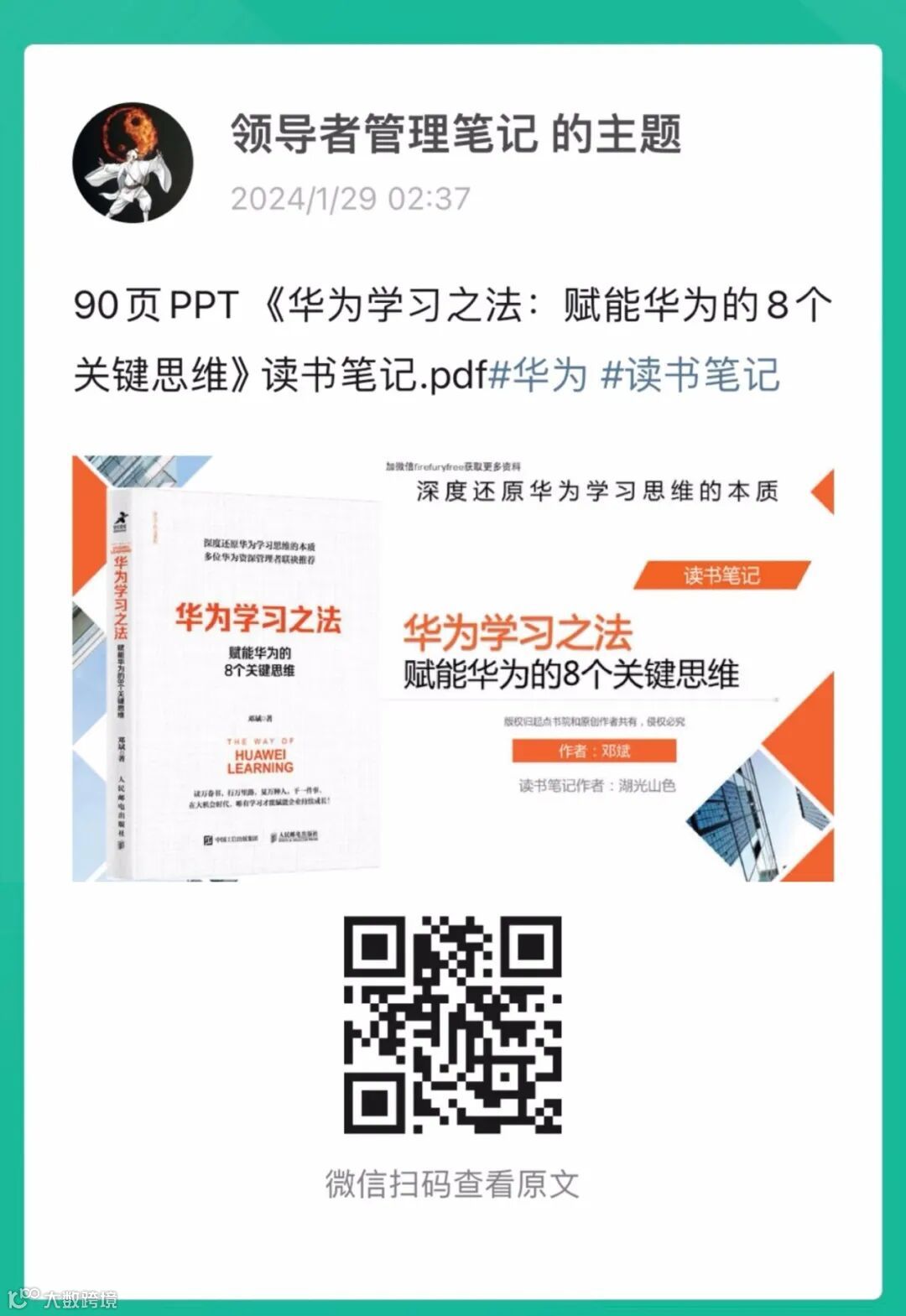 三峯经营了一个《领导者管理资料》“知识星球”,主要是面向企业管理人员、领导者提供“管理&领导力”相关的资料与咨询沟通,会员超过1800人,资料超过2700份,并且每天都在更新。扫描下方二维码加入《领导者管理资料》“知识星球”可以获得“职场破局、时间管理、阿里管理三板斧、易经智慧、思维工具、沟通能力等在内的10份付费视频课程”。