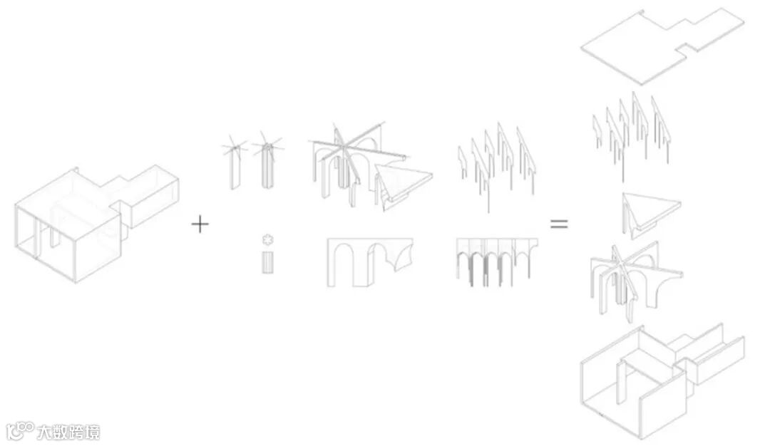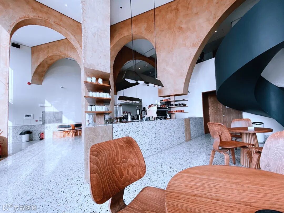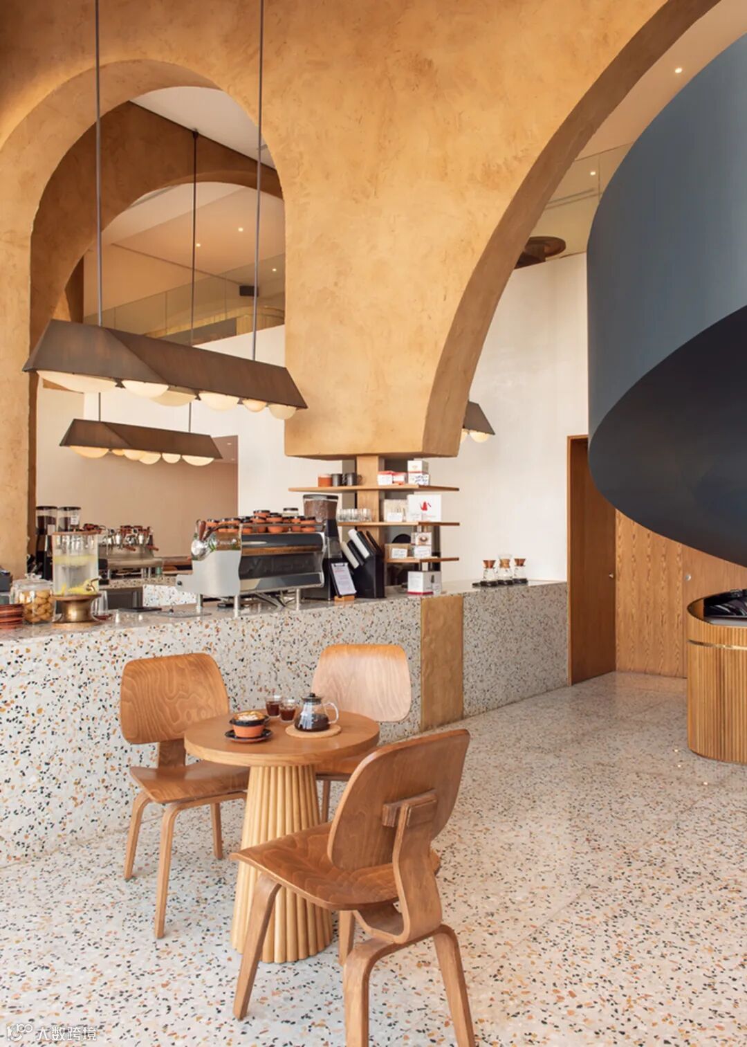 今天,沙特阿拉伯的咖啡业正在蓬勃发展。为了顺应这一趋势,Azaz建筑师将空间打造成了一个“强装饰性的神庙”。空间中心的承重柱给设计师带来了挑战,Azaz建筑师事务所的团队巧妙地化解了这一难题,他们将其转变为设计的亮点,在柱子上延伸出不同的形状,形成了巨大的拱门。 Since then, coffee in the region has evolved, and today, the coffee industry in Saudi Arabia is flourishing. To match that progression, Azaz Architects created the space as a “Deco Temple” . The structural column in the center of the space created a challenge for the designers. However, the team at Azaz Architects embraced it, transforming it into the center point of its design. New walls blossomed from the column, shaped into massive overreaching arches.