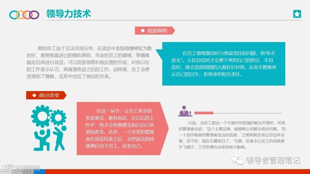 ►领导者说:★过去的企业管理员工,靠的是严格约束;现在企业管理员工,靠的是相互吸引。一个有野心的管理者,需要将每名员工变成团队的战略合作者。