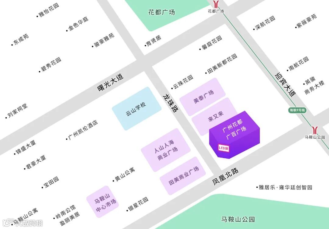 广告位位置正是人流量最多的广百新一城,地处花都新城区核心商圈的凤凰北路与龙珠路交汇处,周边常住人口达100万人以上