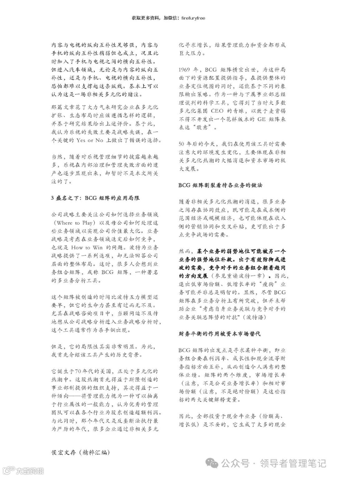 本章回答了一个实务者的疑惑:为何管理权威屡屡告诫多元化损毁价值,而现实中的多元 化企业不断涌现出来。这事关学术研究与管理实践的分歧。随后, 以乐视为例说明了我认为 有用的多元化研究方式。我们还讨论了 BCG 矩阵,一个经典的多元化组合管理工具。