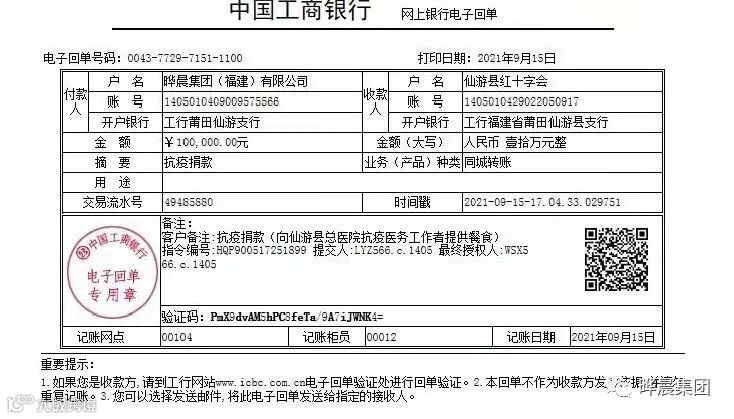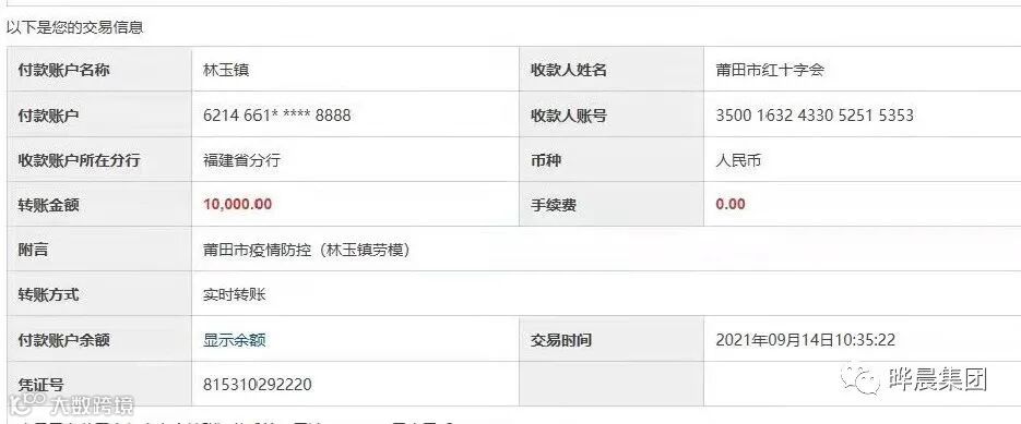 截至9月13日,党支部书记林玉镇个人向莆田市红十字会捐款1万元、晔晨集团(福建)有限公司向仙游县红十字会捐款10万元。