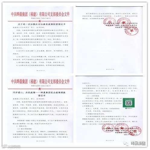 随后通过微信群、朋友圈发布了《关于进一步加强应对仙游县疫情防控倡议书》,之后又下发《守护爱心,共抗疫情——晔晨集团抗击疫情捐款倡议书》,号召集团公司党员、职工积极行动起来,带头落实疫情防控各项措施,积极筹措、捐赠资金,携手同心,为打赢这场疫情防控阻击战贡献力量!