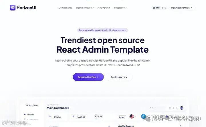 Horizon UI 专注于使用 Chakra UI 和 Tailwind CSS 构建的现代、设计精美的 Next.js 管理仪表板。这些模板附带暗模式支持和高级 UI 组件。
