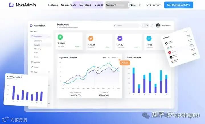 NextAdmin 提供精美的 Next.js 管理仪表板模板,其中包含预构建的 UI 组件,例如图表、表格、表单和分析小部件。这些仪表板轻量级、可自定义且响应迅速,非常适合用作商业智能和管理工具。