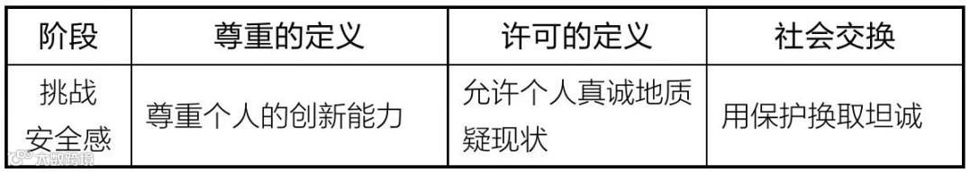 融入安全感要求得到接纳,学习者安全要求得到鼓励,贡献安全感要求得到自主权,但挑战安全感要求的社会交换又到了另一个层次:团队要求你挑战现状。