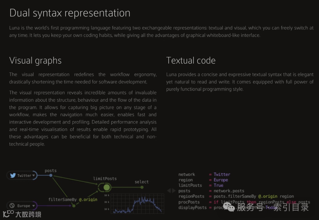 其中一个尝试是 Luna。他们尝试了双重表示:所有内容同时是代码和图表,你可以在两者之间切换: