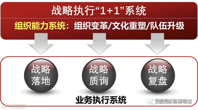 战略执行体系“1+1”系统,从基于目标的业务执行系统到激发活力的组织能力系统,以战略目标和业务运营为主线,辅之以组织、文化以及人才等关键要素支撑,共同打造不依赖于个人的组织执行体系。