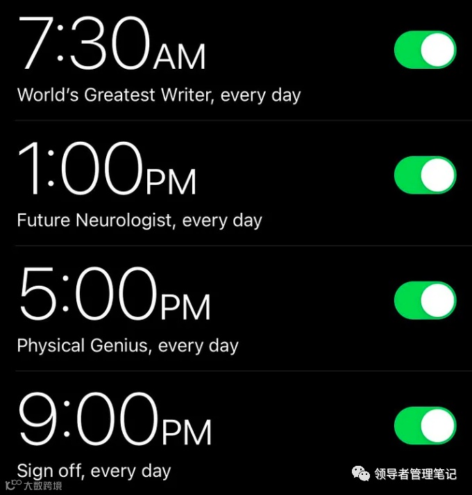 “三醒法则”(Three-Alarm technique)应运而生。我是在萨希尔·布鲁姆(Sahil Bloom)的 Twitter 页面上发现的这个想法。在了解了这个想法之后,我在手机上设置了四个闹钟。一开始有三个闹钟,但几天后我加了第四个,这样我就能记得自己应该什么时候结束一天的工作了。