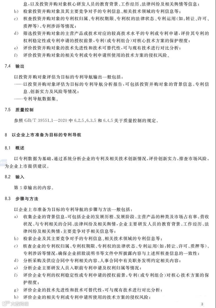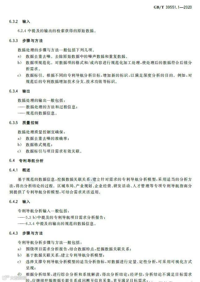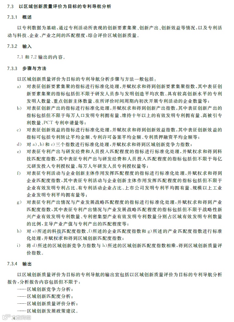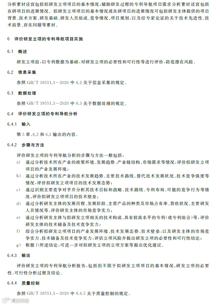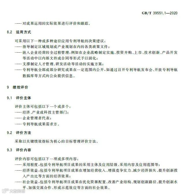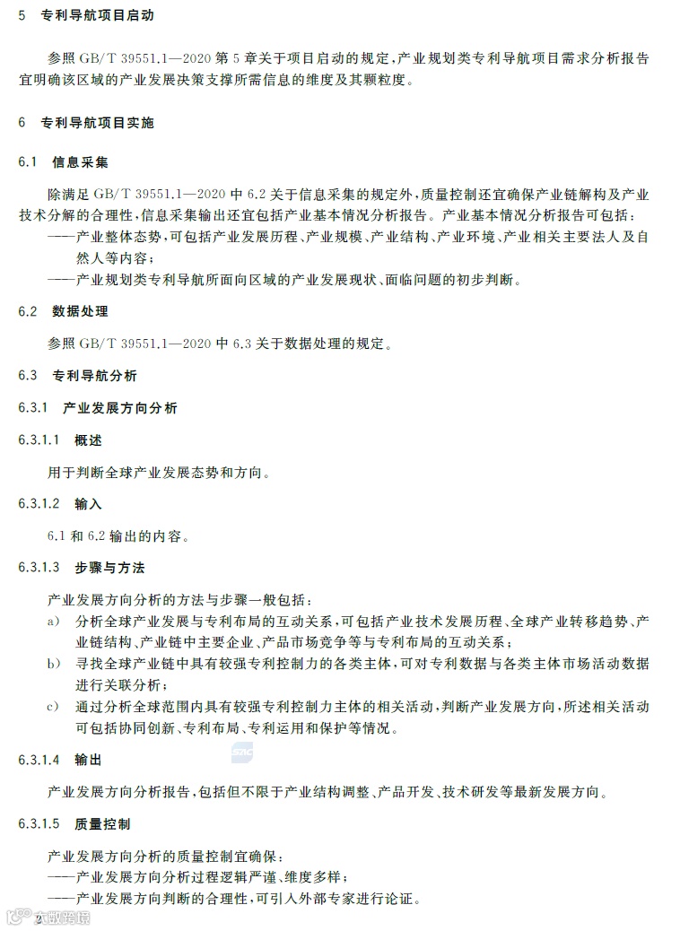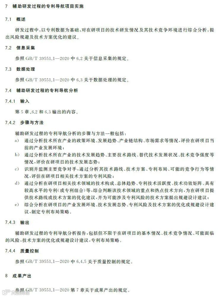 专利导航是在宏观决策、产业规划、企业经营和创新活动中,以专利数据为核心深度融合各类数据资源,全景式分析区域发展定位、产业竞争格局、企业经营决策和技术创新方向,服务创新资源有效配置,提高决策精准度和科学性的新型专利信息应用模式。《专利导航指南》(GB/T39551-2020)系列国家标准为推荐性国家标准,是国家知识产权局对多年来专利导航系列工作成果的总结和凝练,包括总则,区域规划、产业规划、企业经营、研发活动和人才管理等专项指南,以及服务要求等7个标准,主要有以下特点:一是内容的全面性。该系列标准将专利导航试点工程、知识产权分析评议和知识产权区域布局等实践探索的专利信息利用方法,拓展为面向区域规划、产业规划、企业经营、研发活动、人才管理等不同应用场景的专利导航方法,以总则提出专利导航项目实施通用模板,以各专项指南提出面向不同应用场景的逻辑分析模型和特殊要求,以服务要求规定在有外部机构提供相关服务的情况下针对服务提供的全面要求。既有专利导航服务创新资源有效配置的产业、区域等战略层面的内容,又有服务企业技术创新、合规管理、风险防控和投资并购等操作层面的内容。二是方法的实用性。该系列标准将专利导航实施过程解构为专利导航基础条件、专利导航项目启动、项目实施、成果产出、成果运用和绩效评价等工作流程,并对专利导航项目实施中的信息采集、数据处理、专利导航分析等关键步骤分解为输入、步骤与方法、输出、质量控制,便于各类主体灵活运用流程化、模块化的工具和方法开展专利导航工作实践。三是成果的有效性。一方面在项目实施过程中以质量控制的方式加强全过程管理,确保专利导航研究的系统性、分析方法的科学性、成果呈现的规范性,另一方面以绩效评价的方式加强结果管理,要求对照专利导航工作需求,采取目标管理评价方法进行成果运用绩效评价,确保专利导航的决策建议有效应用。