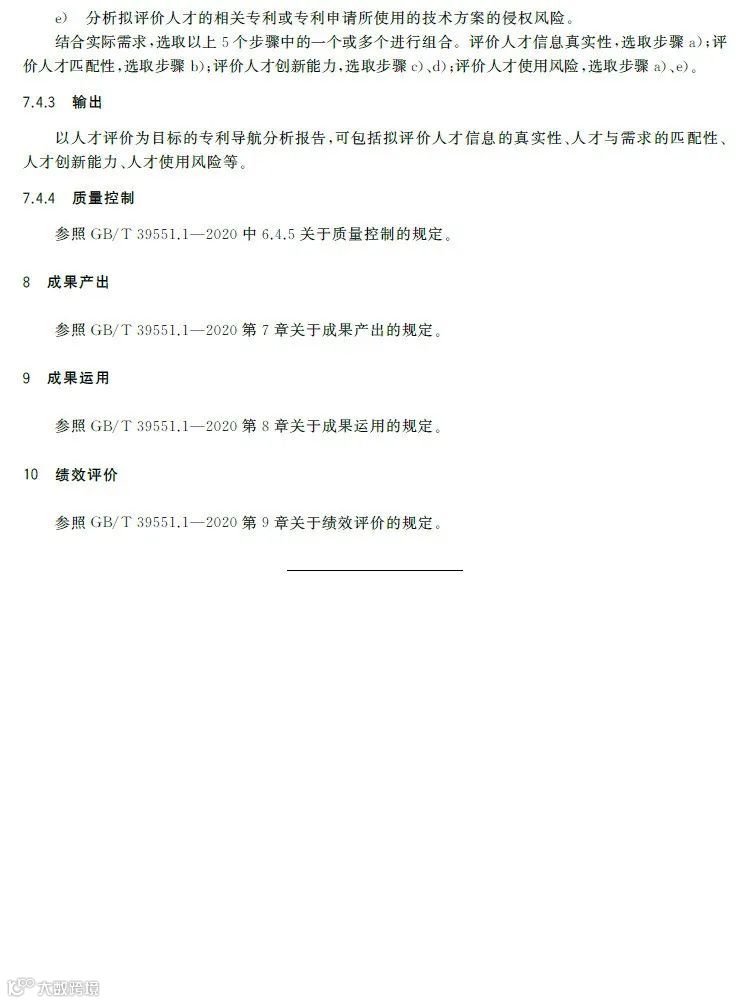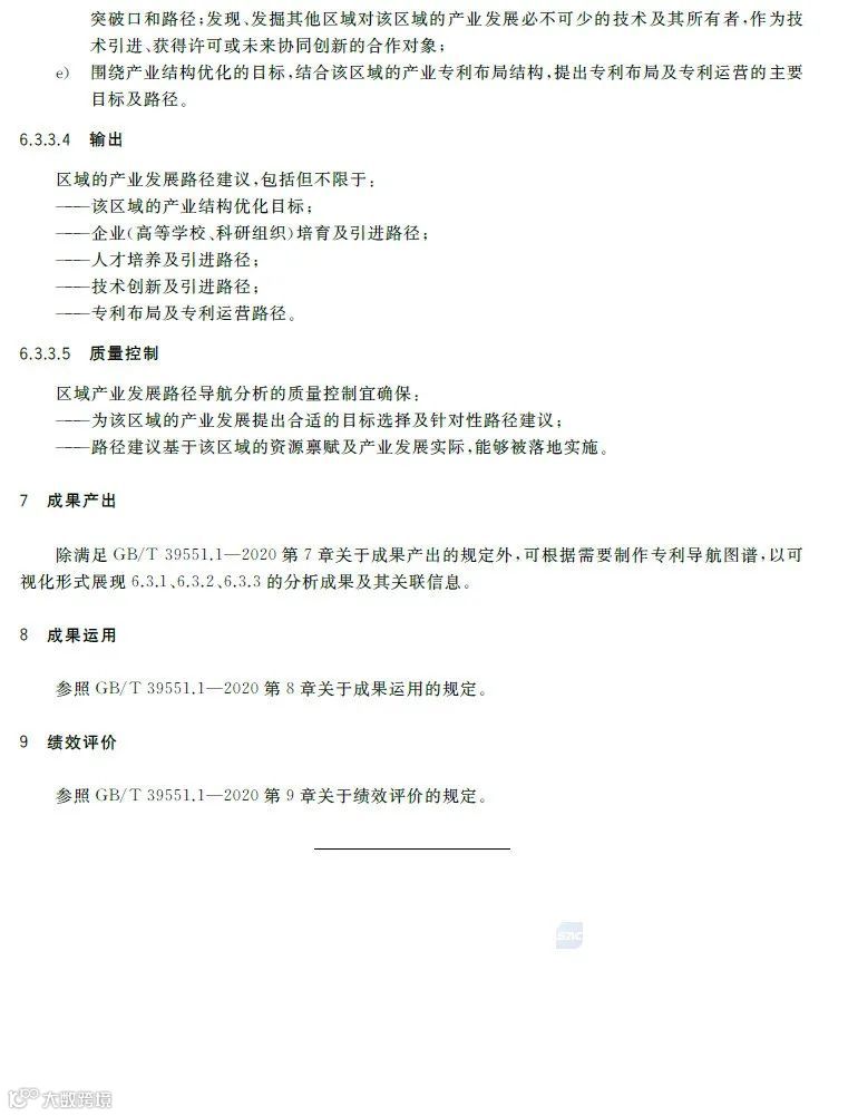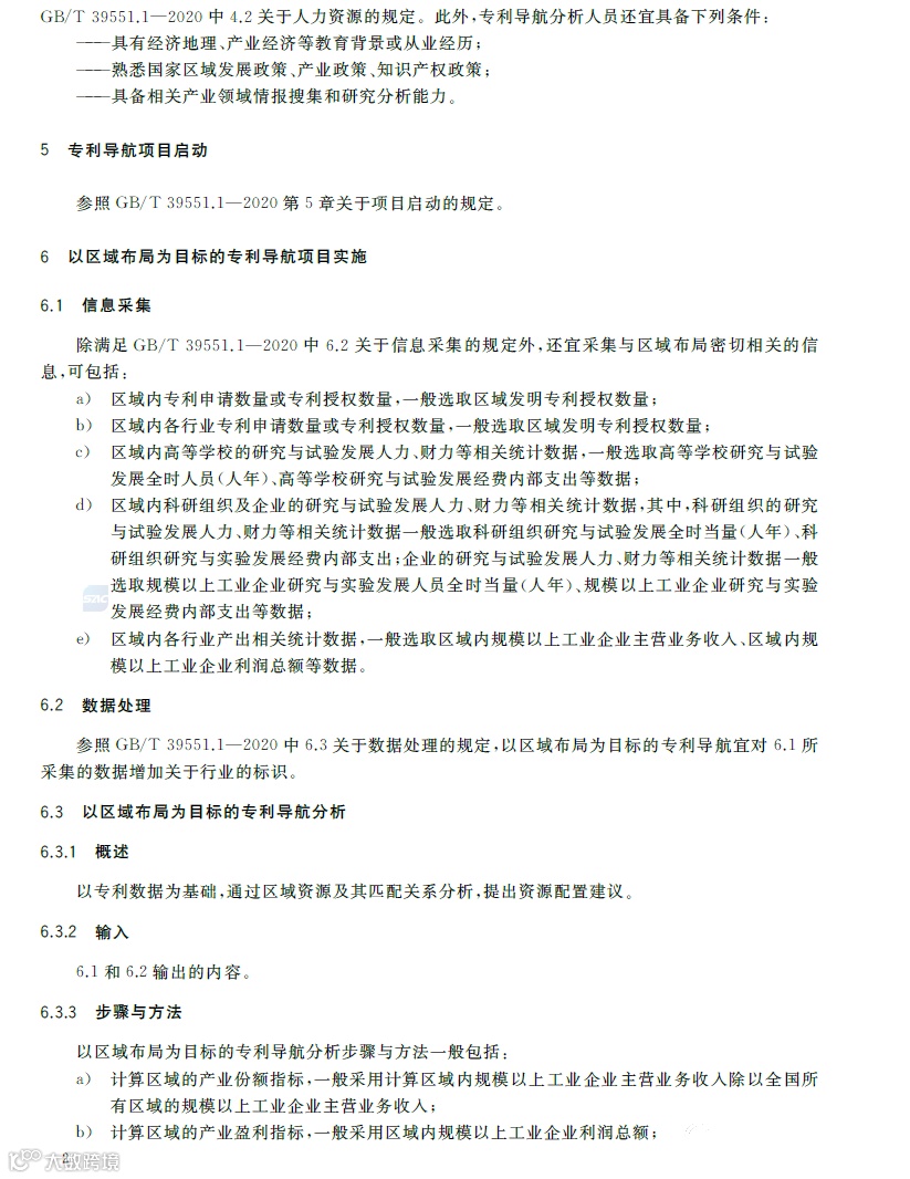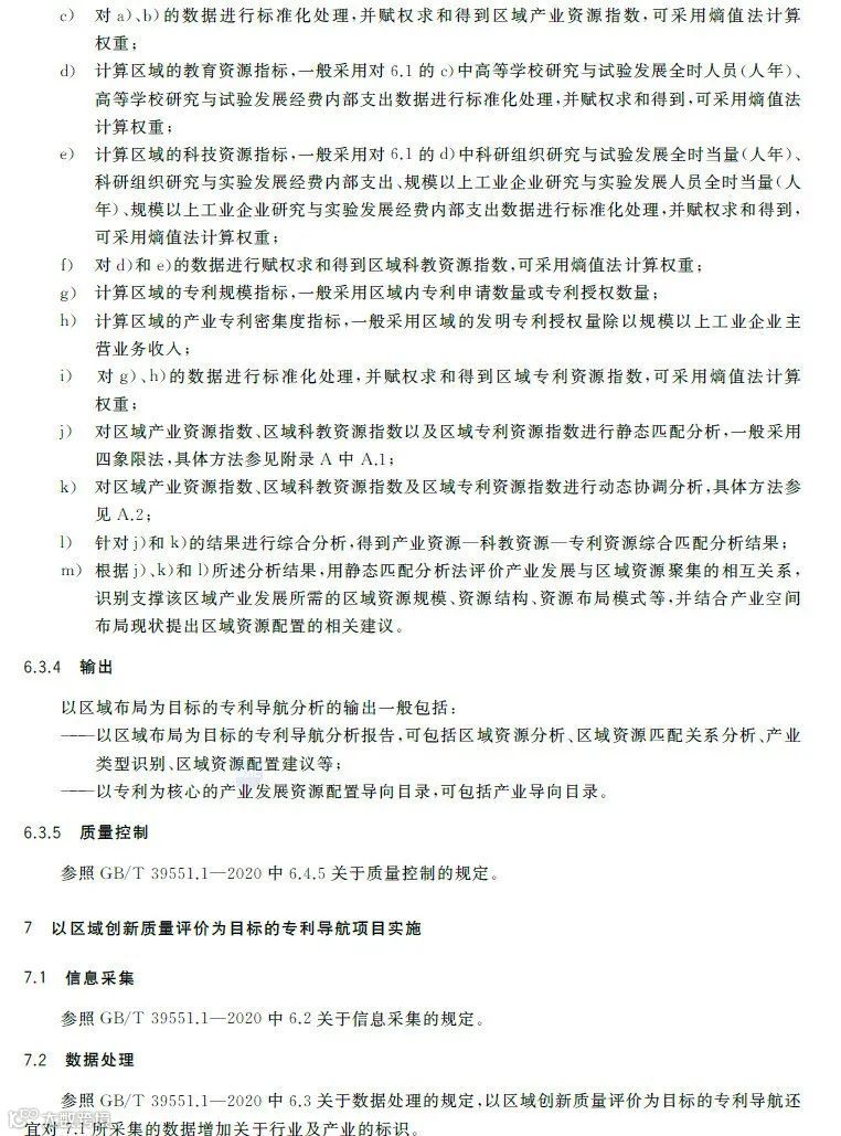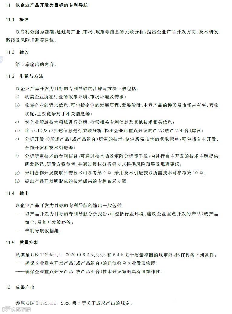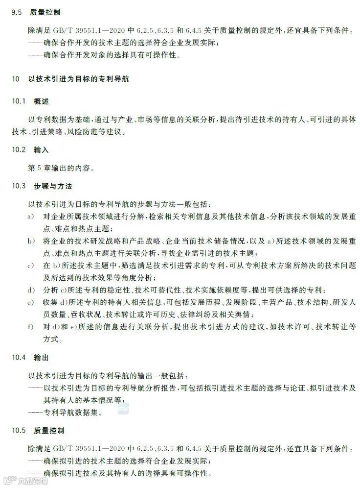 专利导航是在宏观决策、产业规划、企业经营和创新活动中,以专利数据为核心深度融合各类数据资源,全景式分析区域发展定位、产业竞争格局、企业经营决策和技术创新方向,服务创新资源有效配置,提高决策精准度和科学性的新型专利信息应用模式。《专利导航指南》(GB/T39551-2020)系列国家标准为推荐性国家标准,是国家知识产权局对多年来专利导航系列工作成果的总结和凝练,包括总则,区域规划、产业规划、企业经营、研发活动和人才管理等专项指南,以及服务要求等7个标准,主要有以下特点:一是内容的全面性。该系列标准将专利导航试点工程、知识产权分析评议和知识产权区域布局等实践探索的专利信息利用方法,拓展为面向区域规划、产业规划、企业经营、研发活动、人才管理等不同应用场景的专利导航方法,以总则提出专利导航项目实施通用模板,以各专项指南提出面向不同应用场景的逻辑分析模型和特殊要求,以服务要求规定在有外部机构提供相关服务的情况下针对服务提供的全面要求。既有专利导航服务创新资源有效配置的产业、区域等战略层面的内容,又有服务企业技术创新、合规管理、风险防控和投资并购等操作层面的内容。二是方法的实用性。该系列标准将专利导航实施过程解构为专利导航基础条件、专利导航项目启动、项目实施、成果产出、成果运用和绩效评价等工作流程,并对专利导航项目实施中的信息采集、数据处理、专利导航分析等关键步骤分解为输入、步骤与方法、输出、质量控制,便于各类主体灵活运用流程化、模块化的工具和方法开展专利导航工作实践。三是成果的有效性。一方面在项目实施过程中以质量控制的方式加强全过程管理,确保专利导航研究的系统性、分析方法的科学性、成果呈现的规范性,另一方面以绩效评价的方式加强结果管理,要求对照专利导航工作需求,采取目标管理评价方法进行成果运用绩效评价,确保专利导航的决策建议有效应用。