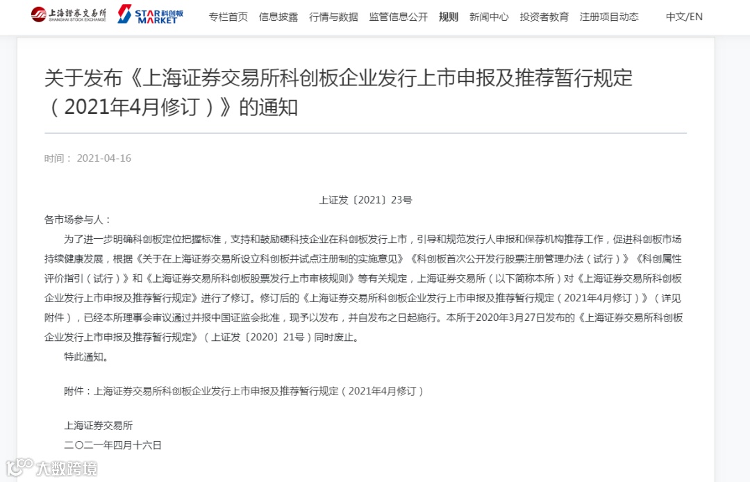 关于发布《上海证券交易所科创板企业发行上市申报及推荐暂行规定(2021年4月修订)》的通知