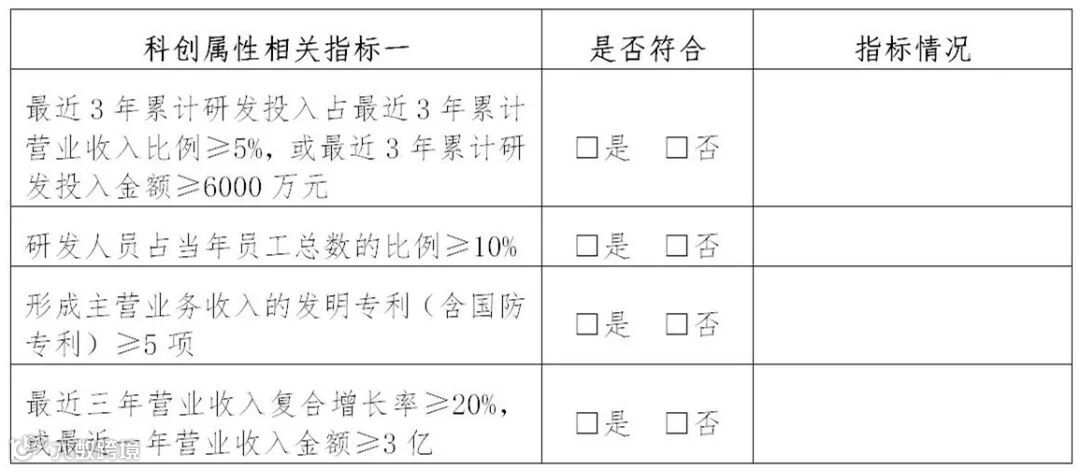 备注:采用《审核规则》第二十二条第二款第(五)项上市标准申报科创板发行上市的企业可不适用上述第(四)项指标的要求;软件企业不适用上述第(三)项指标的要求,最近三年累计研发投入占最近三年累计营业收入比例应在10%以上。