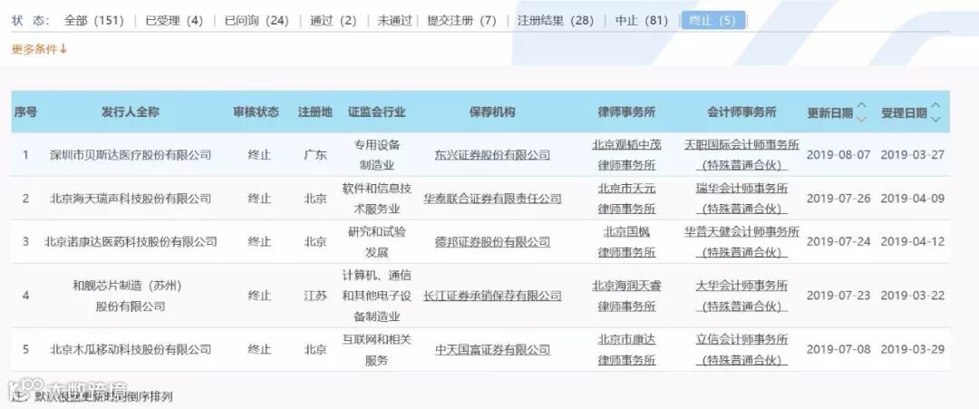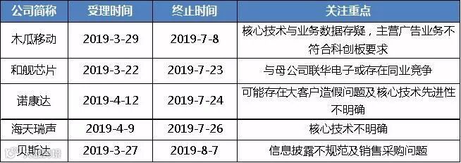 自2019年7月8日木瓜移动宣布终止审核以来,陆续有5家科创板企业终止审核,其余四家分别为和舰芯片、诺康达、海天瑞声和贝斯达,且这五家企业皆为主动撤回。