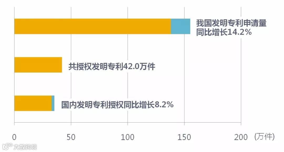 2017年,我国发明专利申请量为138.2万件,同比增长14.2%。共授权发明专利42.0万件,其中,国内发明专利授权32.7万件,同比增长8.2%。