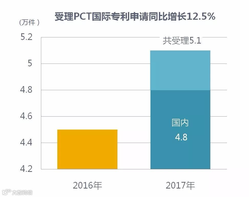 2017年,国家知识产权局共受理PCT国际专利申请5.1万件,同比增长12.5%。其中,4.8万件来自国内,同比增长12.5%。