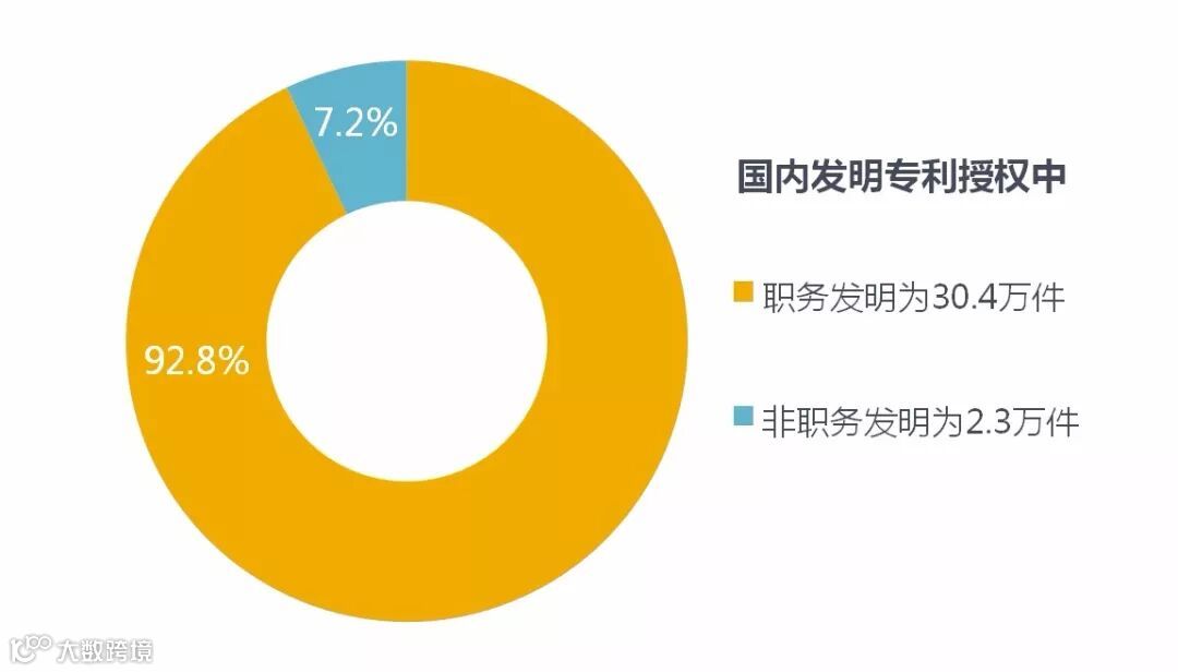 在国内发明专利授权中,职务发明为30.4万件,占92.8%;非职务发明为2.3万件,占7.2%。