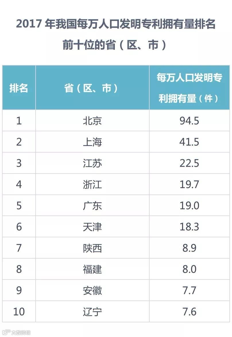 截至2017年底,我国国内(不含港澳台)发明专利拥有量共计135.6万件,每万人口发明专利拥有量达到9.8件。我国每万人口发明专利拥有量排名前十位的省(区、市)依次为:北京(94.5件)、上海(41.5件)、江苏(22.5件)、浙江(19.7件)、广东(19.0件)、天津(18.3件)、陕西(8.9件)、福建(8.0件)、安徽(7.7件)和辽宁(7.6件)。