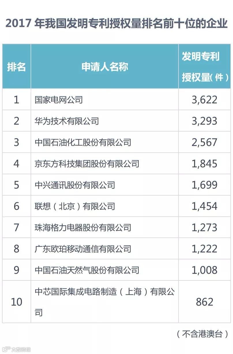 2017年,我国发明专利授权量排名前十位的企业(不含港澳台)依次为:国家电网公司(3,622件)、华为技术有限公司(3,293件)、中国石油化工股份有限公司(2,567件)、京东方科技集团股份有限公司(1,845件)、中兴通讯股份有限公司(1,699件)、联想(北京)有限公司(1,454件)、珠海格力电器股份有限公司(1,273件)、广东欧珀移动通信有限公司(1,222件)、中国石油天然气股份有限公司(1,008件)、中芯国际集成电路制造(上海)有限公司(862件)。