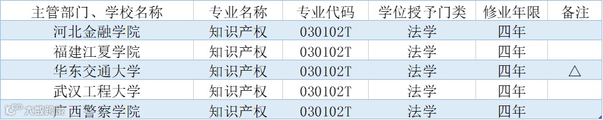 近日,教育部发布《关于公布2019年度普通高等学校本科专业备案和审批结果的通知》,公布了2019年度普通高等学校本科专业备案和审批结果。5 所高校设置“知识产权(法学)本科专业”(030102T)。