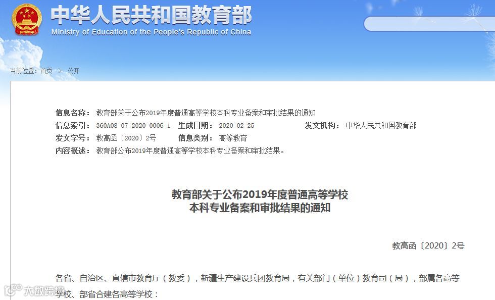 教育部关于公布2019年度普通高等学校本科专业备案和审批结果的通知