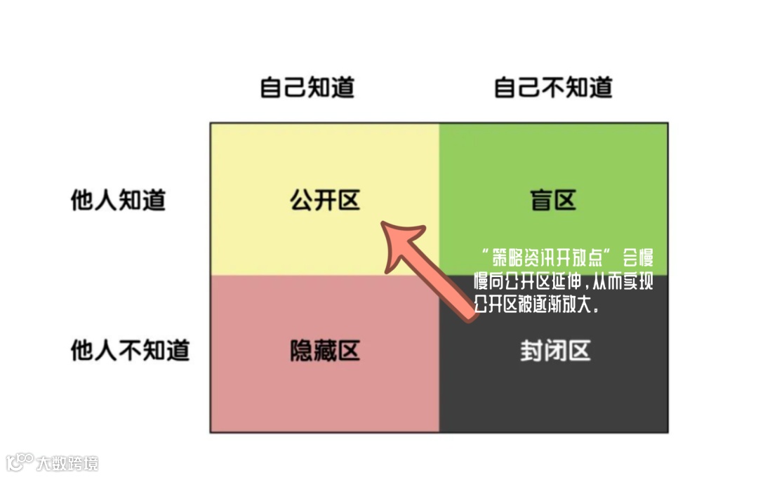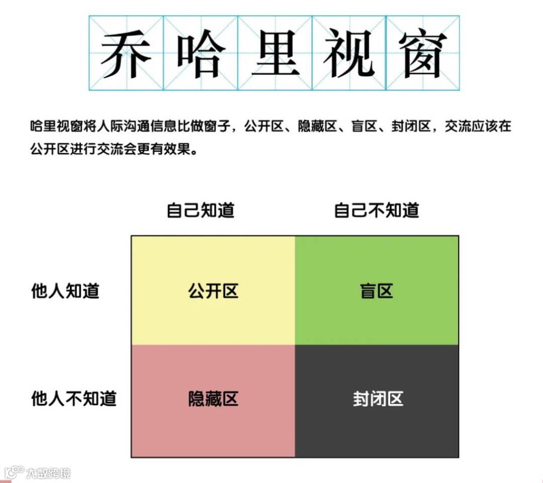 乔哈里视窗(Johari Window):是一种关于沟通的技巧和理论。根据这个理论,人的内心世界被分为四个区域:公开区、隐藏区、盲区、封闭区。