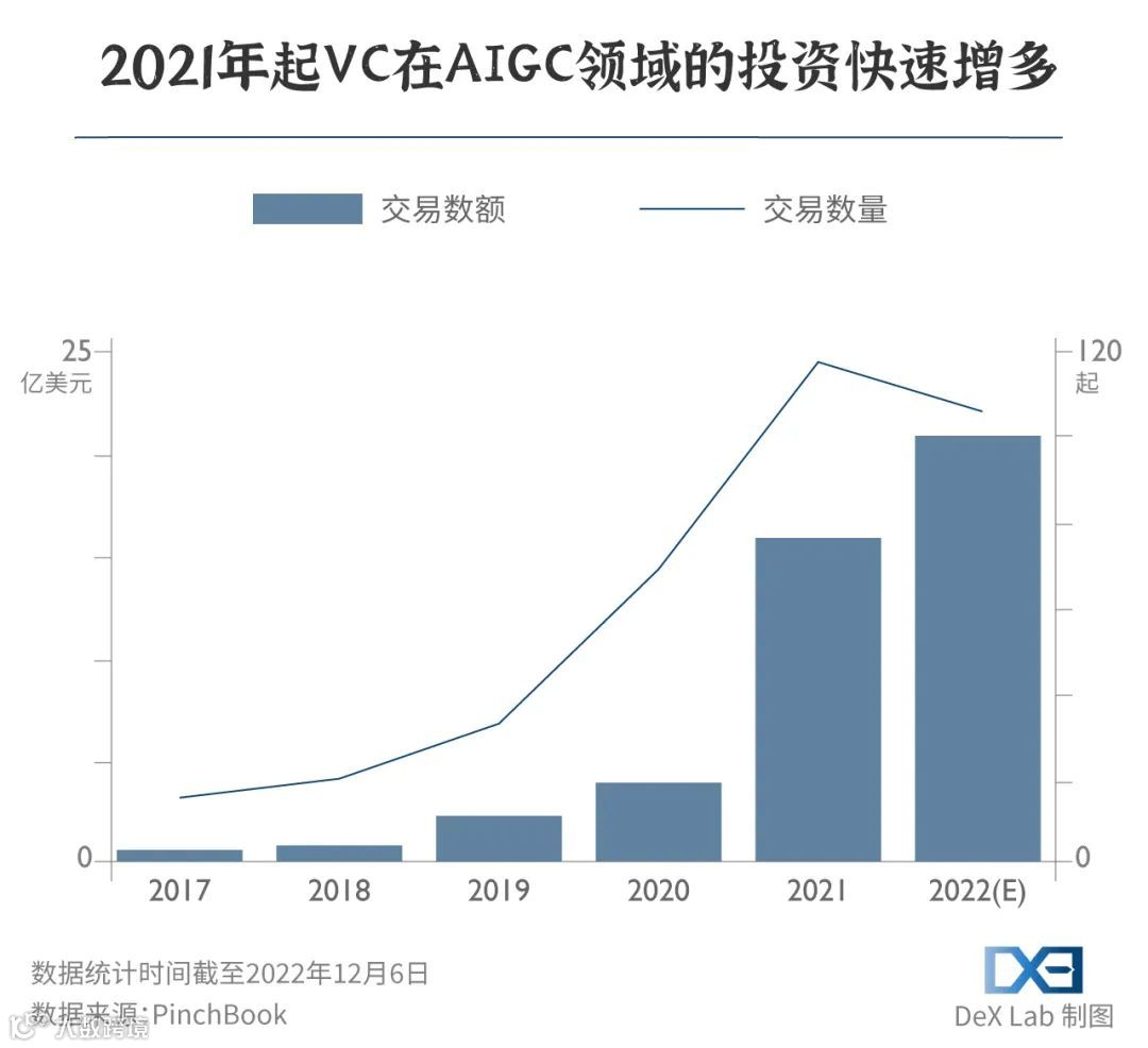 图像模型可以迅速创造,并引导人们迅速消费,同时又能以较低成本快速整合到不同领域,从而快速普及,掀起浪潮。而事实上,确实许多创业者涌入了这些领域。AIGC成为了币圈之后的投资新焦点。在 GPT-3 发布的两年内,风投资本对 AIGC 的投资增长了四倍,在 2022 年更是达到了 21 亿美元。
