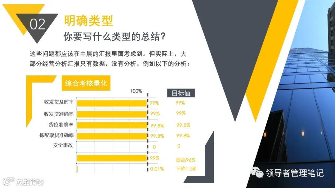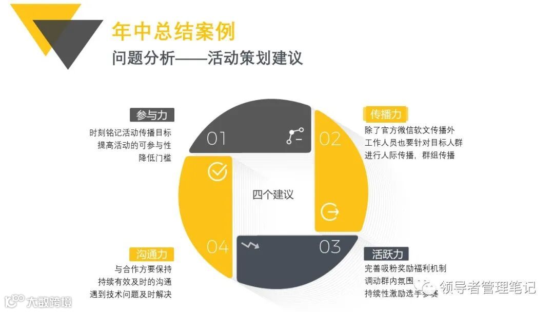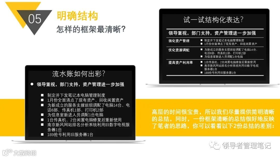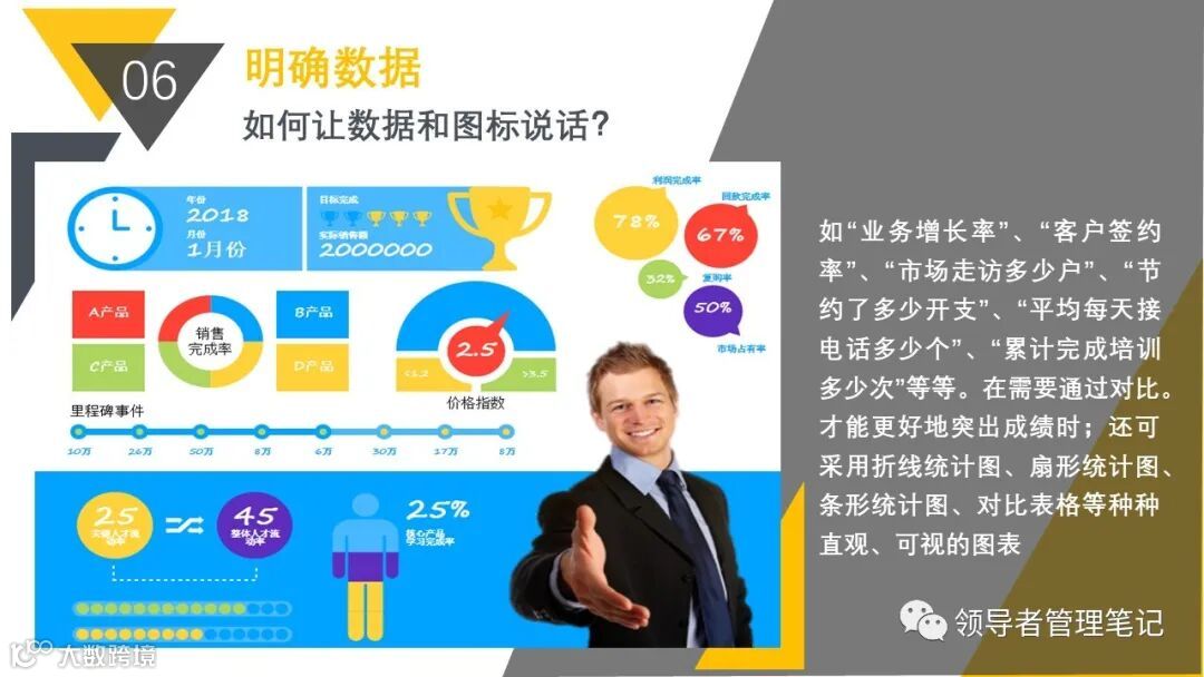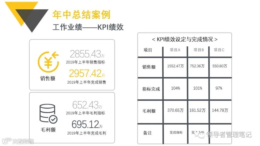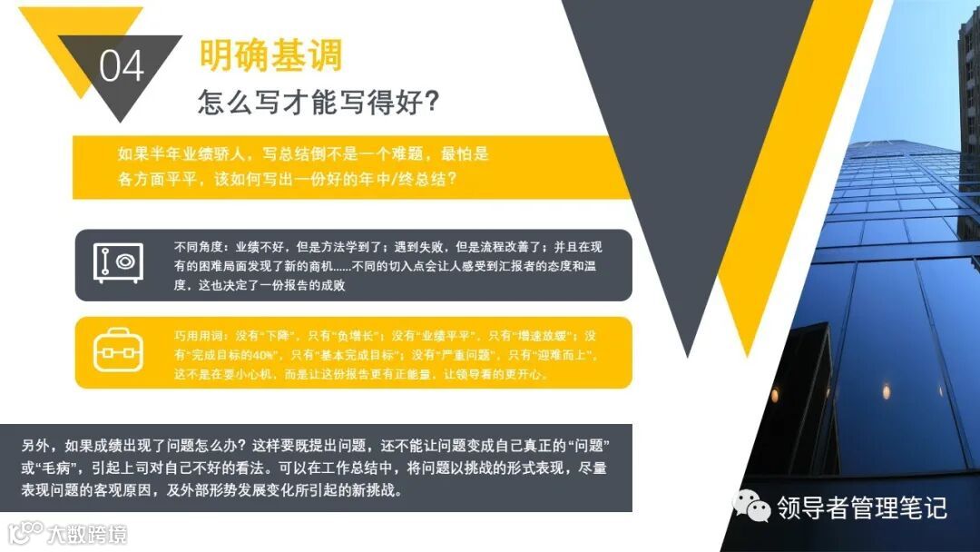 ►领导者说:★每年的年中总结和年末总结,总是难倒一大批员工,平时工作不难,但是需要将之前的工作汇总却不容易。有人甚至说“做得好不如总结得好”,虽然这不是职场正道,但却实实在在道出了一个真理:好的总结汇报真的很重要。