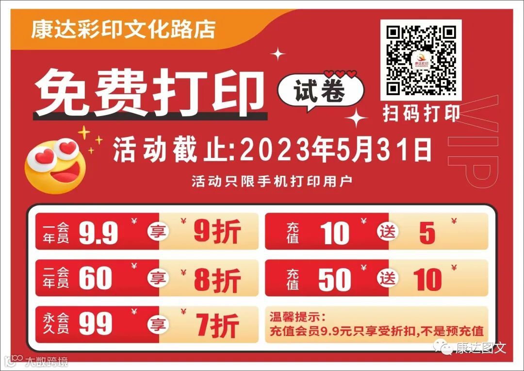 导读:好消息康达彩印文化路店免费打印活动开始了,5月13日到5月31日,每个微信手机用户免费打5次,每次免费5张不